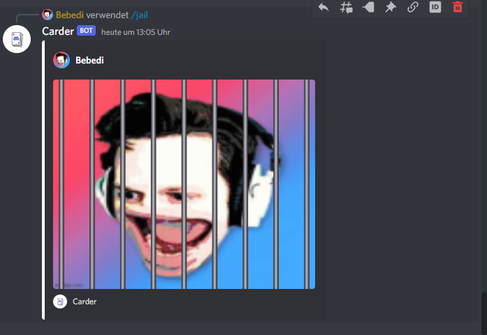 For example typing /jail will generate an image where the profile picture of the specified user is behind jail bars.