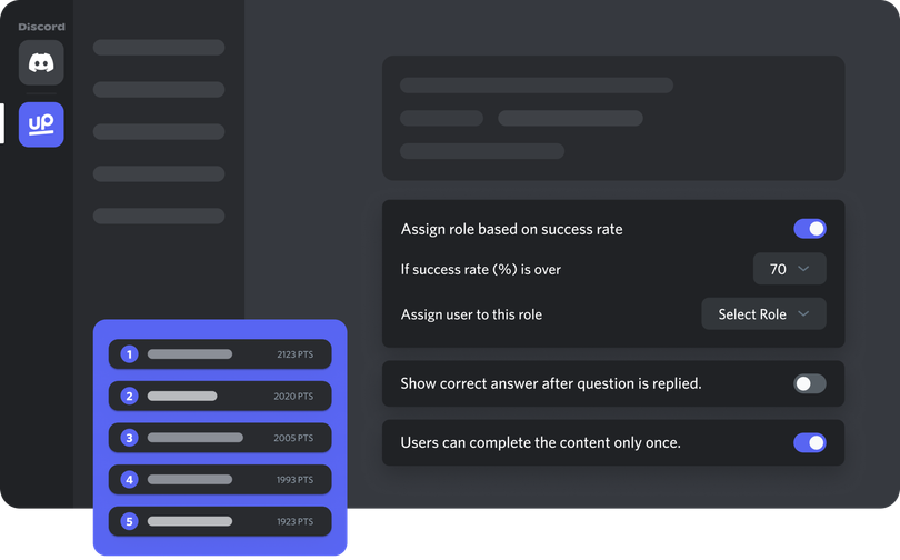 Assign roles based on quiz results by setting a pass or fail threshold. For instance, allow users to access exclusive channels if their ratio of correct answers is above 70%. You can customize quizzes with advanced features such as turning on/off the display of correct answers, allowing single or multiple attempts, and showing a leaderboard.
