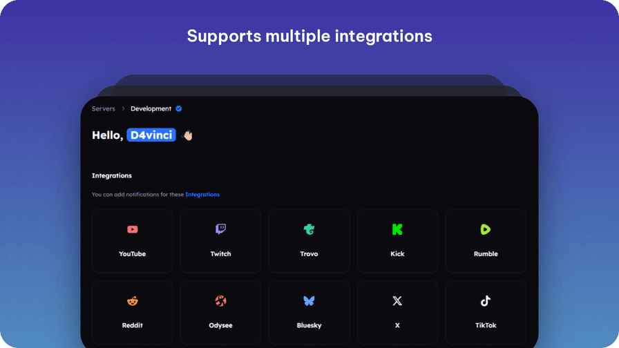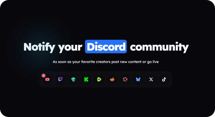 Receive instant alerts in your Discord server whenever your favourite creators on YouTube, Twitch, Kick, TikTok posts, Trovo, Odysee or Rumble start a live stream, upload a video, or post on Reddit, Bluesky or X (formerly Twitter).