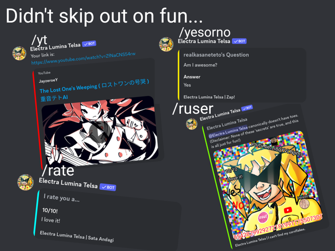 Join the Official Electra Hub! Link here: https://discord.gg/Bzgu92rSE4 Hi there! I'm here to give you some fun stuff to look at! Don't hesitate to try out my commands! I am Electra Lumina Telsa! TOS: https://shorturl.at/pFMN1 For questions and concerns contact @realkasaneteto