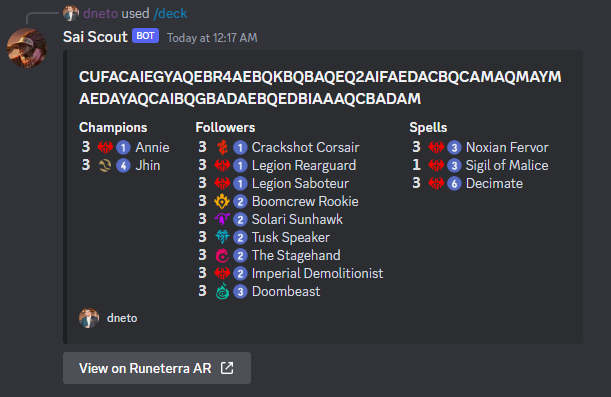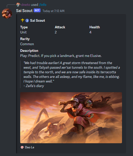 Sai Scout is a Discord bot for showing Legends of Runeterra cards in a visual way.