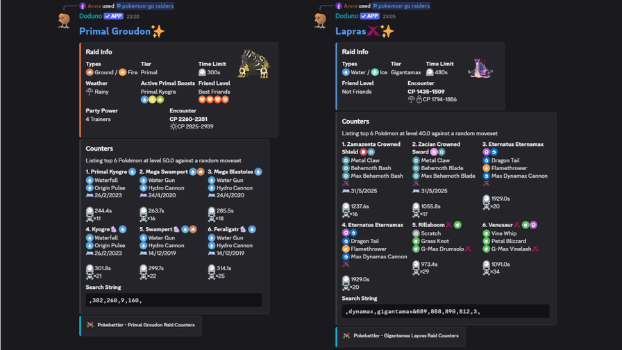 Get a more detailed simulation result of a raid or max battle by using the /pokemon-go simulator command, which finds the best Pokémon against the boss from your Pokebattler Pokebox, showing how likely they are at successfully winning the battle in time. Filters and additional conditions can be applied like the /pokemon-go raiders command has. Specific Pokebattler battle parties can also be chosen.