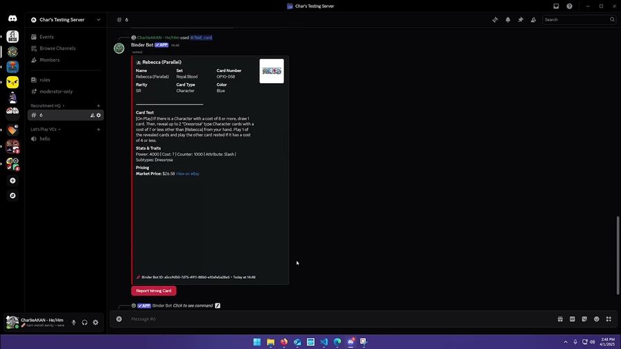 /find_card– Scan any supported card and get instant pricing and details./pregrade_card– Let the bot estimate your card's grade before sending it to PSA. (Whispers: it undergrades, just to be safe 😏)/setup_binderbot– For admins, configure channels and scan limits./more_scans– Unlock premium scan plans for your server.