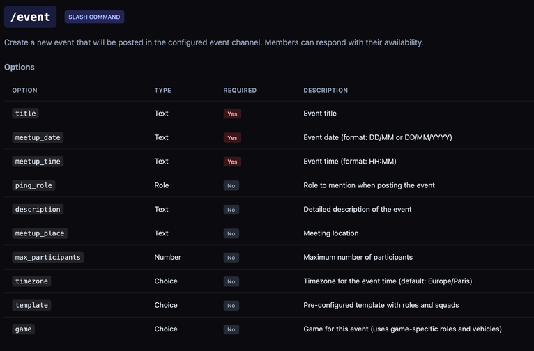 Create events directly in Discord using clear, interactive embeds. Members can sign up in one click, select their roles, and instantly view event details and participants.