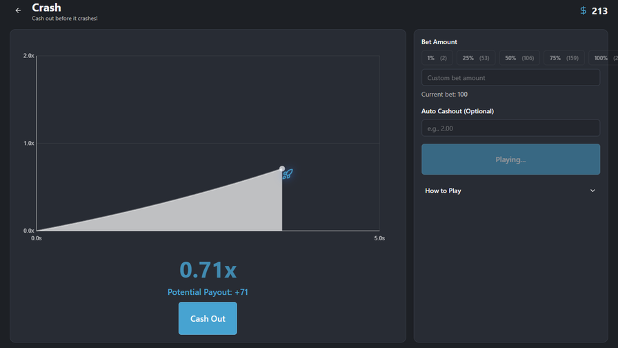 Every game supports quick bet presets (1%, 25%, 50%, 75%, 100%) plus custom amounts. Your balance is validated in real time โ no accidental overspend.