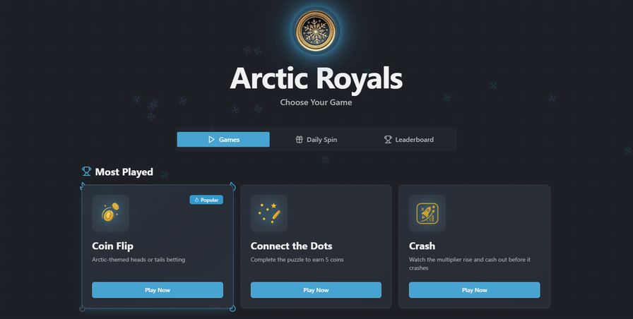 Arctic Royals is a full casino arcade built for Discord servers. Play 17+ games live with friends in voice chat, flex your balance on public leaderboards, earn exclusive achievement tags, and customize your entire experience โ all using virtual coins (no real money, ever).