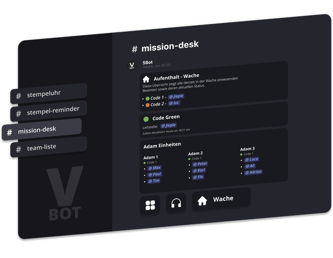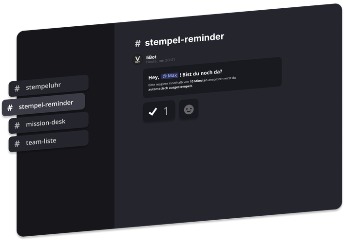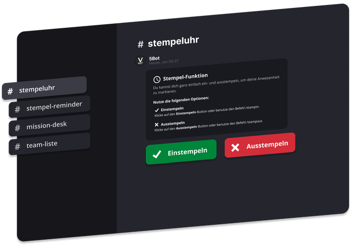 FiveBot unterstützt dich und dein Team beim Einstempeln & Ausstempeln, verwaltet Rollen automatisch und speichert alle Zeiten zuverlässig in einer Datenbank.