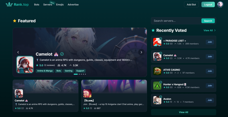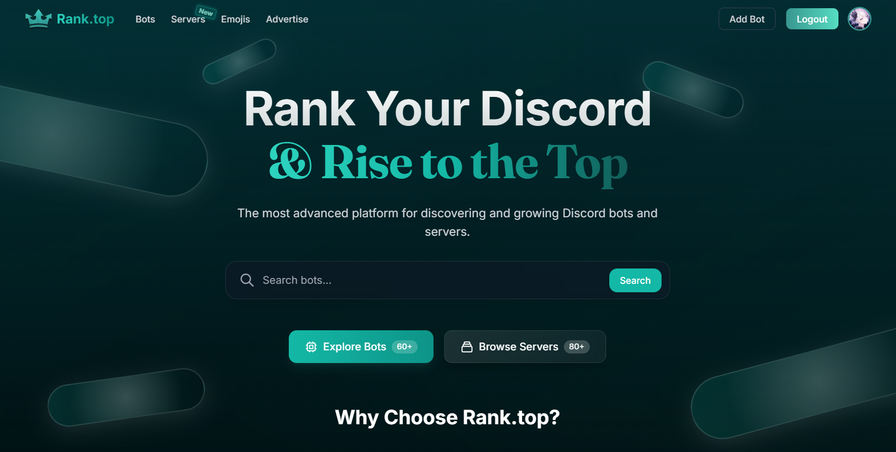 Rank.top is the ultimate platform to discover, list, and promote Discord bots and servers. Whether you’re a developer showcasing your latest bot or a community owner looking to grow your server, Rank.top gives you powerful tools to rise to the top.