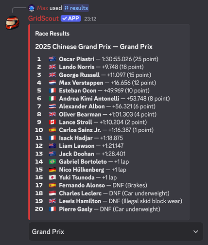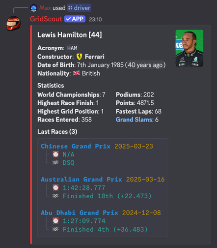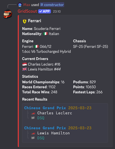 GridScout is the ultimate F1 Discord bot for Formula 1 fans, bringing live race data, driver stats, and Grand Prix alerts straight to your server.