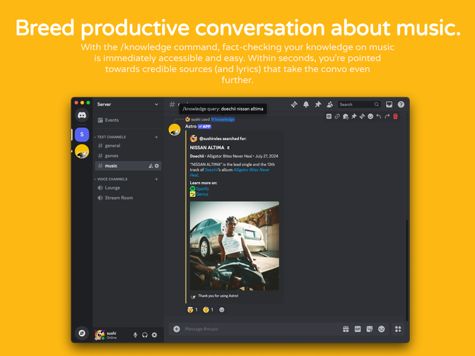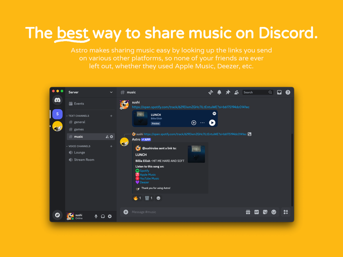 Astro is a Discord app that makes sharing music easier. It passively sits in your server, scans music service links from Spotify, Apple Music, YouTube/YouTube Music, Deezer and TIDAL, and provides more links to where you can find said music. No subscriptions or setup required.