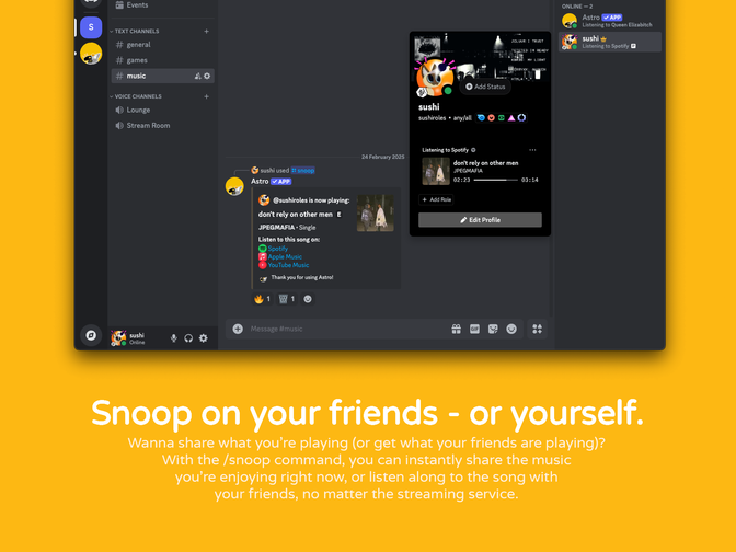 /snoopcommand, Astro will look up the Spotify track they're listening to and find it on other services. - Cover Art Showcase! Want to see your favorite cover art up close? Use the