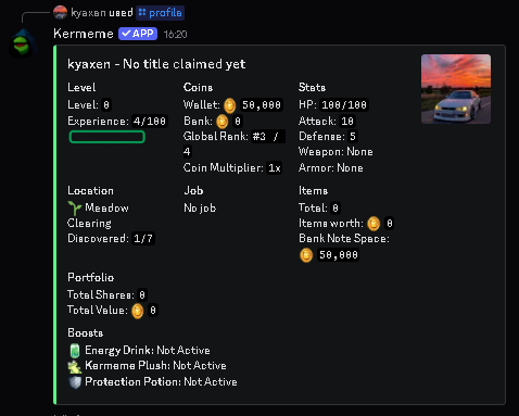 /create-account — start your journey/help — see categories and commands/profile — your stats, gear, location, and progress/shop — browse, view, and buy items/map — view all locations & unlock tiers/location <name> — travel for higher multipliers