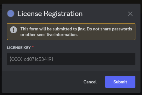 Jinx is a free, open source Discord bot that grants roles to users in your server when they register Jinxxy license keys.