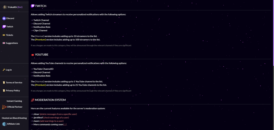 From the Bot’s website, you can Invite the Bot to servers, Manage tickets, Create, manage, and send giveaways, Create, manage, and send auto-role menus, Manage suggestions, Manage Twitch and YouTube notifications, Manage the moderation system, Manage blacklist and warning system.