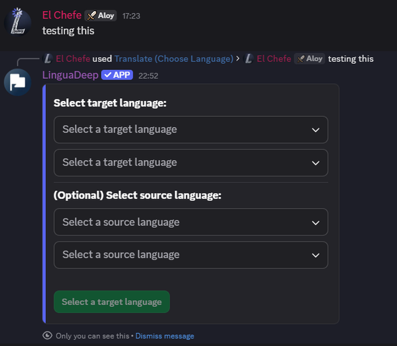 /translate— Translate text:/translate text:"Hello" target_lang:"es"/preferred-language— Set default target:/preferred-language set language:"fr"/key— Manage your DeepL key:/key set api_key:"YOUR_KEY" deepl_version:Free- Message Actions — Right-click messages for quick or custom translations.