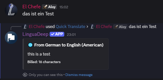 Translate text and messages effortlessly with DeepL! This bot uses your own DeepL API key for translations (BYOK). All responses are ephemeral (private to you).