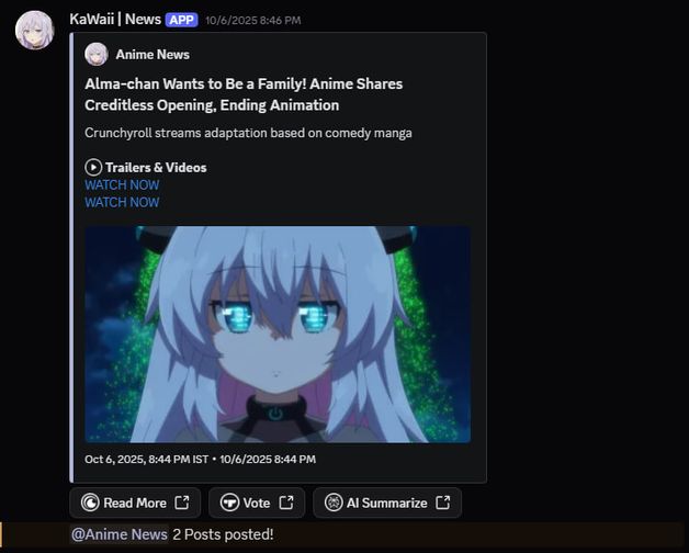 - Live anime news, updates, and alert system right in your channels