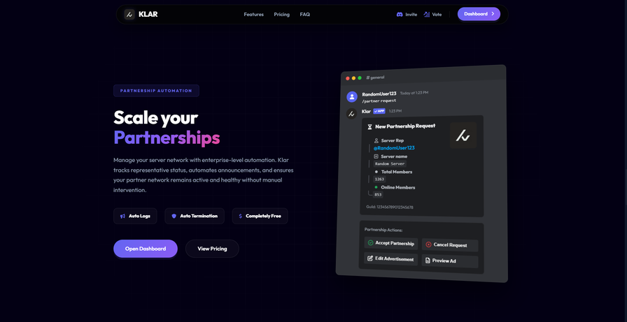 ❖ Automated Partner System The ultimate suite for alliance managers. › Seamless Requests │ Automated flow for submitting, accepting, and tracking partnerships. › Smart Requirements │ Automatically enforce member count limits and verify invites. › Admin Logging │ Detailed tracking of every partnership action. › Ad Parsing │ Intelligent extraction of server stats from invite links.