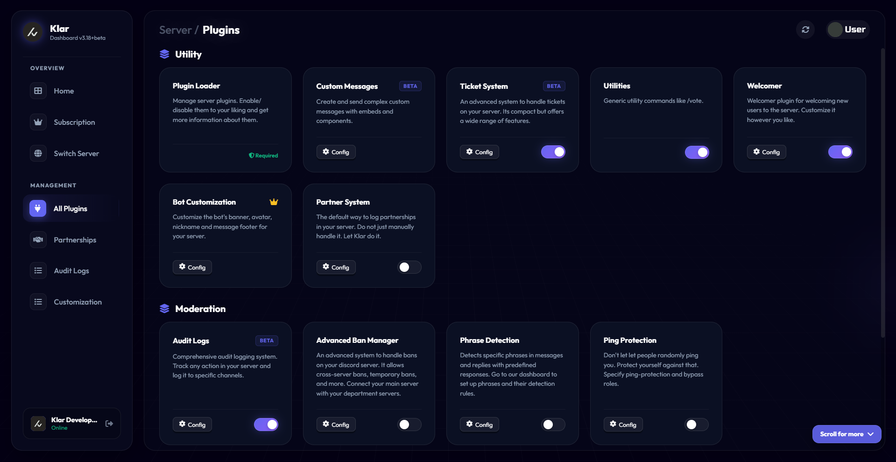 ❖ Network Protection & Moderation Keep your community safe and organized. › Global Ban Sync │ Share ban lists across your trusted server network. › Auto-Mod │ Intelligent Phrase Detection to filter unwanted content. › Ping Protection │ Robust anti-spam measures. › Audit Logs │ Comprehensive visibility into server events.