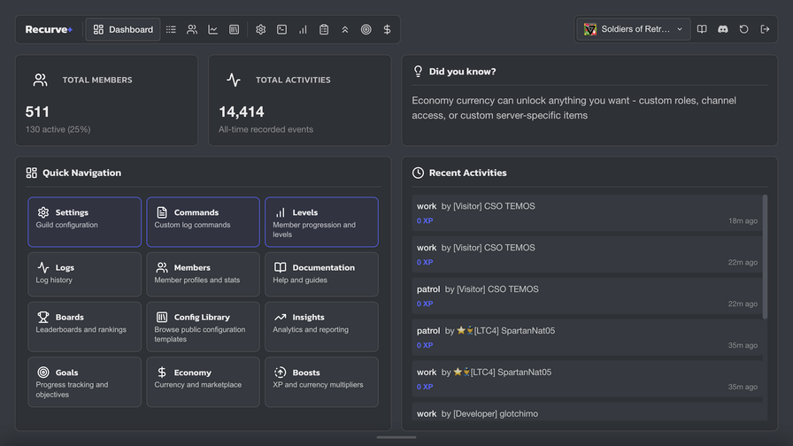 Transform your Discord community with Recurve, the powerful progression and activity tracking bot that keeps members engaged and growing. Whether you're running a gaming clan tracking missions, a roleplay server managing character advancement, or any community wanting to reward participation, Recurve's flexible system lets you create custom activities, track progress, and automate promotions with beautiful formatting and robust statistics.