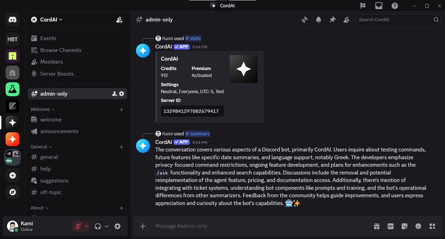 To learn more, use the /help command, join https://discord.gg/hc34UC27aY, or visit https://cordai.app/.