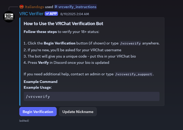 - Interactive Instruction Panel Use slash-commands to drop an Instruction Panel right into any channel. It guides members step-by-step through linking their VRChat badge, with clickable buttons and real-time status feedback—all inside Discord.