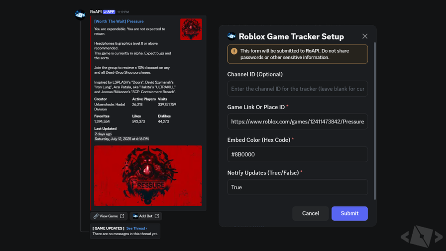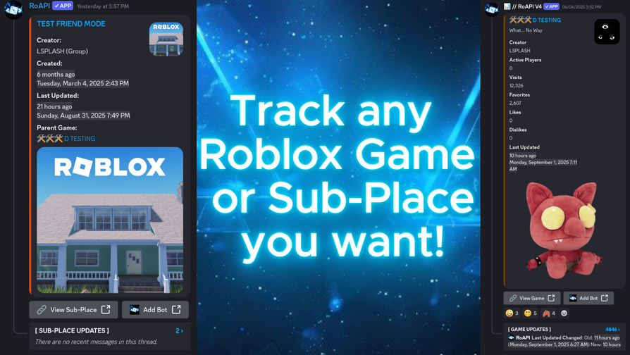 RoAPI - Roblox Game Tracker Bot From letting you get notifications for when games update to weekly, monthly and yearly stat reports to even notifications for newly created badges, dev products, and game passes (in development) RoAPI has it all. All of the data and notifications are compiled into a simple embed and thread, making it easy to check the statistics and receive notifications right through Discord.