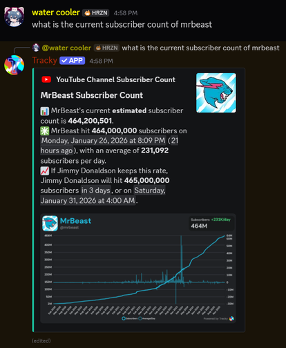 With its commands, you can also view the current subscriber count or daily average of a channel, predict their subscriber count, and even look back at their past subscriber count history, all in one bot. You can even ask questions as regular messages, and Tracky will respond to them with an accurate answer nearly instantly!