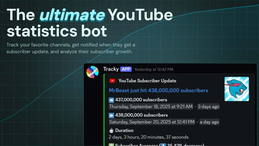Tracky currently tracks over 50,000 of the most popular YouTube channels, including MrBeast, PewDiePie, and many more of your favorites, and has already tracked over 10 million subscriber updates and counting into over 100 Discord servers.