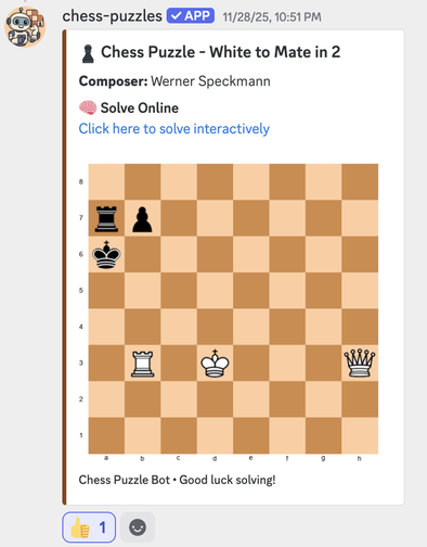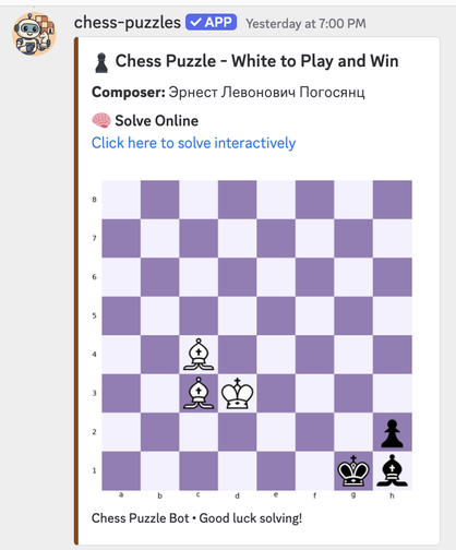 I will share chess puzzles. Just add me and have a channel with either "chess" or "puzzle" as a keyword in it. I will post one puzzle in it daily.