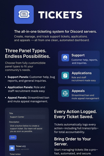 Tickets is designed to bring structure, efficiency, and accountability to Discord communities of all sizes. By centralizing ticket creation and management into a single, intuitive system, it eliminates cluttered channels, missed requests, and untracked actions.