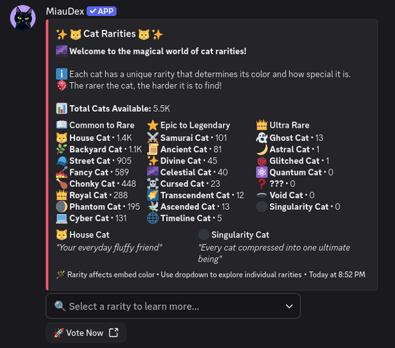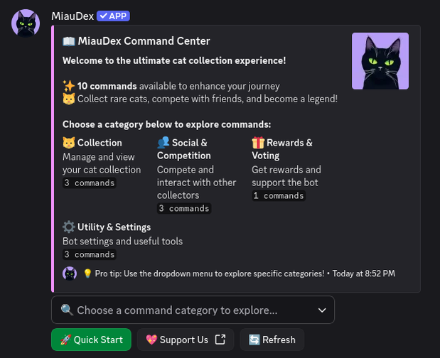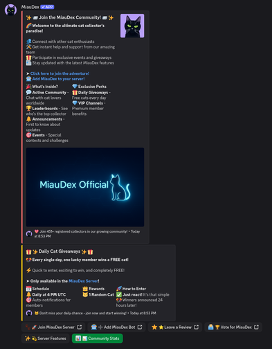 Built with performance, style, and customization in mind — MiauDex is perfect for cozy servers, anime communities, pet lovers, and anyone who wants a bit of joy in their day.