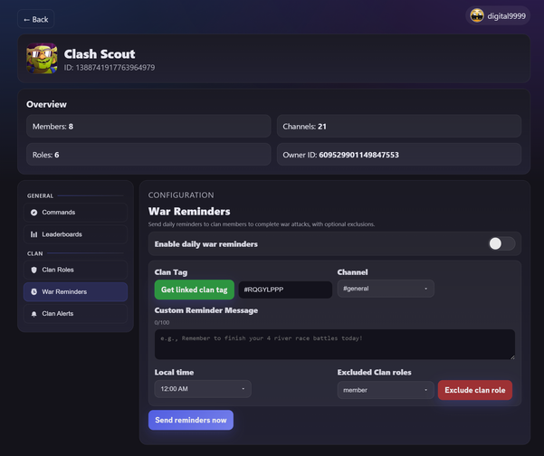 • Easy Configuration Manage bot settings and discover every feature on our web dashboard: https://clashscout.dev/