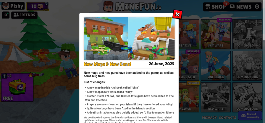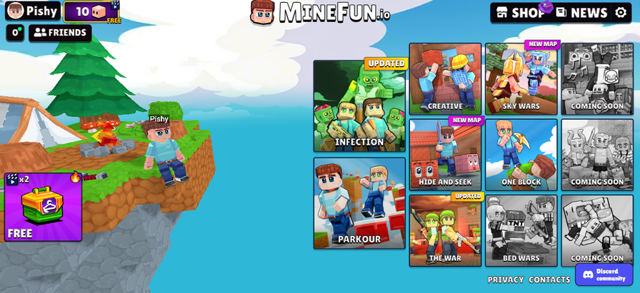 Jump into the blocky, action-packed world of MineFun.io, where creativity meets chaos! Whether you're building with friends in Creative, surviving the zombie horde in Infection, or battling in Sky Wars, there's a mode for everyone.