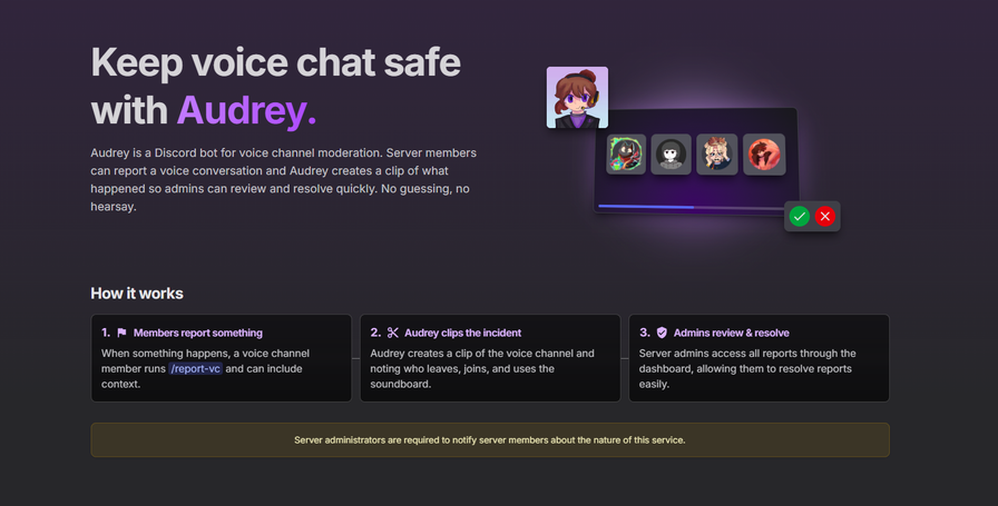 Audrey is a Discord bot for voice channel moderation. Server members can report a voice conversation and Audrey creates a clip of what happened so admins can review and resolve quickly. No guessing, no hearsay.