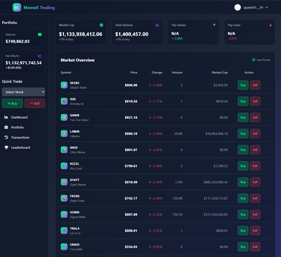 📈 Real-Time Meme Market — Trade dynamic meme stocks with live price changes.