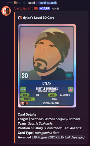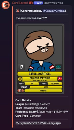 CardSavant is a Discord Bot that tracks user activity in text & voice channels and awards experience points. These add up to earning levels and gaining personalised trading cards.