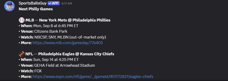 I give information on phillies and eagles games. Daily post at specified time that will show if there are games today, what time, and where they are streaming. Use /sports to run set up.