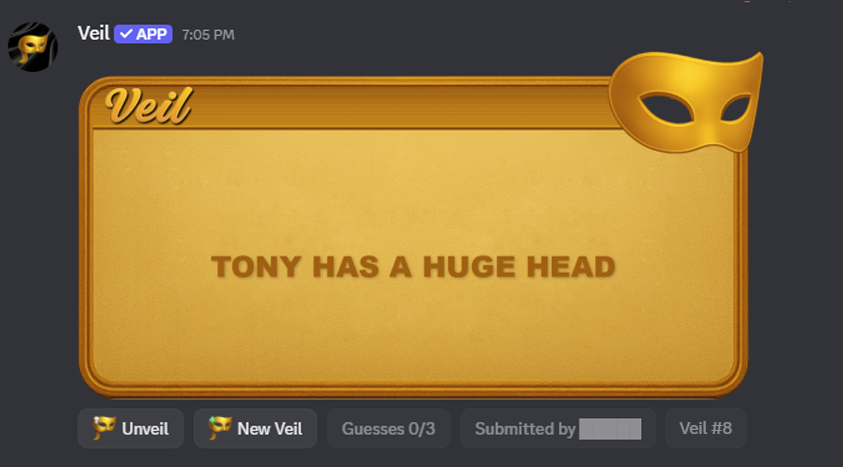 No one sees your name or avatar — just the golden veil. Mods can set channels, limits, and rules to keep it fun.