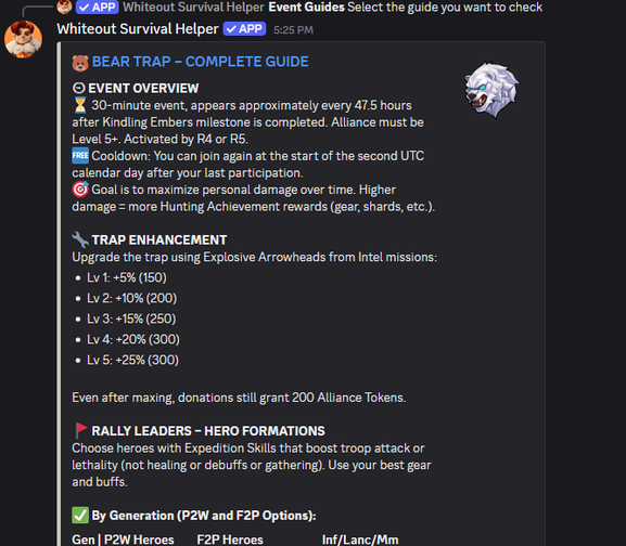 Whiteout Survival Helper is the best Discord bot for Whiteout Survival players! it's made for the mobile game Whiteout Survival. It gives you guides, codes, art, tips, and more — all inside your server.