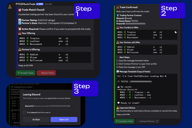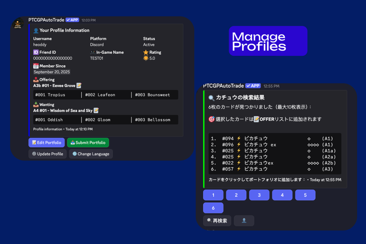 Streamline your Pokémon TCGP trades with PTCGPAutoTrade, the all-in-one Discord bot designed to simplify portfolio management, enhance trading efficiency, and connect you with a global community of traders. Say goodbye to spreadsheets and endless DMs—PTCGPAutoTrade has you covered!