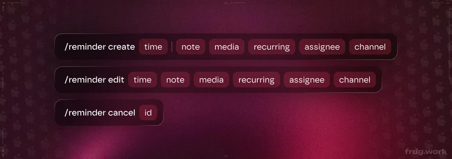 /reminder create: Create a new reminder for you or someone else, optionally recurring/reminder edit: Edit existing reminders and change the time, note, assignee, etc./reminder list: List all active reminders within a server/reminder cancel: Cancel an active reminder (Managers can cancel others' reminders)