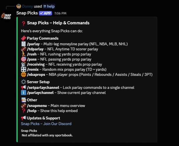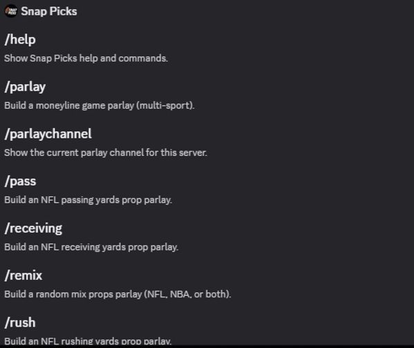🛠️ Server Tools /setparlaychannel – Lock all parlay/props commands to one channel /parlaychannel – See where parlays are currently locked /snapmenu – Simple main menu with all core commands /help – Full command list and usage