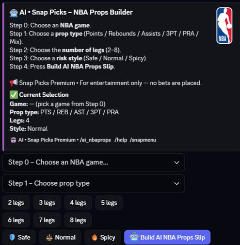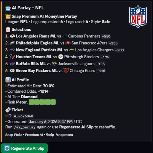 Snap Picks is an automated sports analytics & parlay builder designed exclusively for Discord.