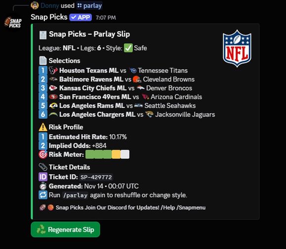 Snap Picks is a fully automated sports analytics and parlay builder for Discord Whether you’re into NFL, NBA, MLB, or NHL, Snap Picks builds moneyline parlays, player props, and mixed “remix” slips in one click, all inside sleek Discord embeds with team logos and a simple risk meter.