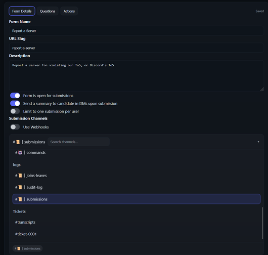 - Send submissions to a webhook, the user's dms and a specified channel! So you can send submissions to your staff server - if you have one.