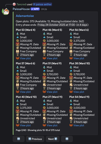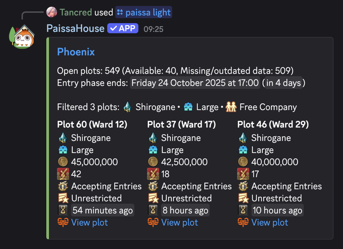 /paissa [datacenter] [world]→ Use this command to find housing information for a data center and world of your choice. You can further filter it within the command using the optional parameters. You can filter it by:[district]→ Housing District (Mist, The Lavender Beds, The Gauntlet, Shirogane, Empyreum)[size]→ Plot Size (Small, Medium, Large)[lottery-phase]→ Current Phase (Accepting Entries, Results, Unavailable, FCFS, Missing/Outdated)[allowed-tenants]→ Who can enter the lottery (Free Company, Individual)