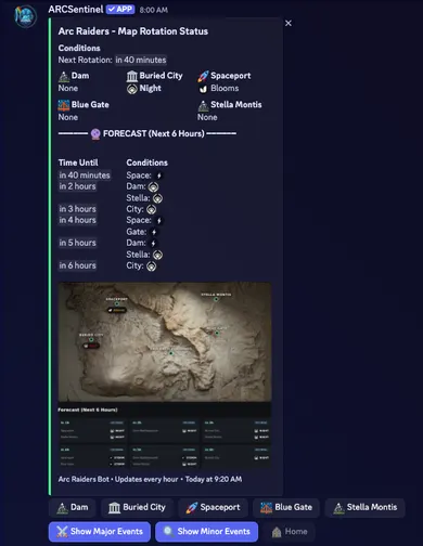 ArcSentinel Bot keeps Arc Raiders servers up to date with hourly map rotations (Dam, Buried City, Space Port, Blue Gate, Stella Montis) on the official 24-hour UTC schedule.