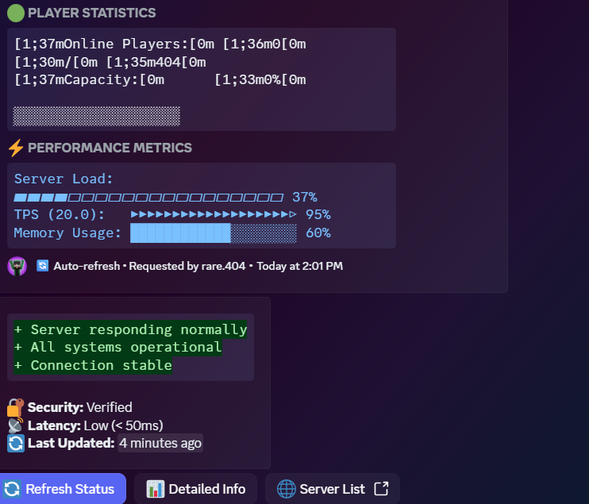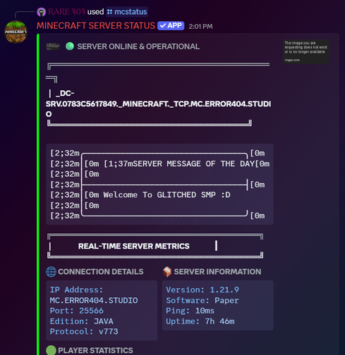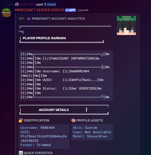 This is a discord bot that is used to check the minecraft servers are online or offline also check minecraft username skins and uuid . also you get the namemc.com link to the respective profile bot Made by - RARE404 discord username - rare.404 you can DM me For bot update and customisation.