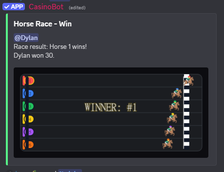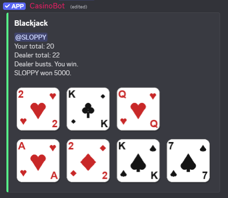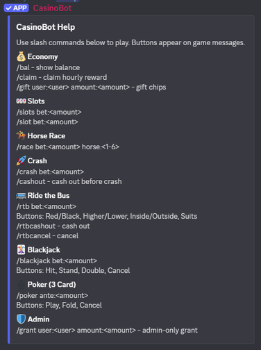 A simple Discord casino bot for friends that uses fake currency you can claim daily. Bet on quick games like slots, blackjack, horse racing, and Ride the Bus, track your balance with prefix commands, and keep progress saved between restarts. No real money, just bragging rights.